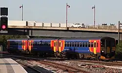 They run a mixture of Class 158s and Class 170s with 158s normally confined to the Norwich to Liverpool stretch.[33] EMR introduced Class 170s to replace the153s and 156s which have since been withdrawn,[34] and initially the 158s, which will now be kept for the foreseeable future and are planned for refurbishment along with the 170s.[35][36][37][38][39]