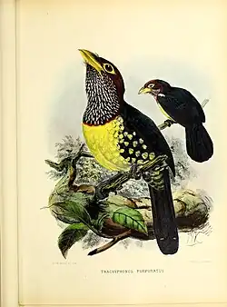 The eastern yellow-billed barbet (Trachylaemus purpuratus) is a species of bird in the Lybiidae family. It was formerly considered to be conspecific with the western yellow-billed barbet.