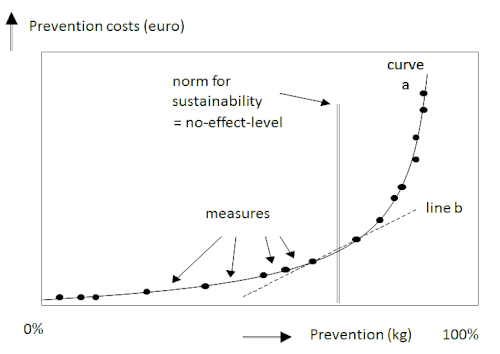 Marginal prevention costs of toxic emissions are derived from the so-called prevention curve as depicted in Figure 2. The basic idea behind such a curve is that a country (or a group of countries, such as the European Union), must take prevention measures to reduce toxic emissions (more than one measure is required to reach the target). From the point of view of the economy, the cheapest measures (in terms of euro/kg) are taken first. At a certain point at the curve, the reduction of the emissions is sufficient to bring the concentration of the pollution below the so-called no-effect-level. The no-effect-level of CO2 emissions is the level that the emissions and the natural absorption of the earth are in equilibrium again at a maximum temperature rise of 2 degrees C. The no-effect-level of a toxic emission is the level where the concentration in nature is well below the toxicity threshold (most natural toxic substances have a toxicity threshold, below which they might even have a beneficial effect), or below the natural background level. For human toxicity the 'no-observed-adverse-effect level' is used. The eco-costs are the marginal prevention costs of the last measure of the prevention curve to reach the no-effect-level. See the abovementioned reference 4 and www.ecocostsvalue.com for a full description of the calculation method (note that in the calculation 'classes' of emissions with the same 'midpoint' are combined, as explained below).