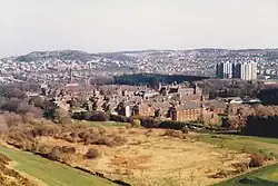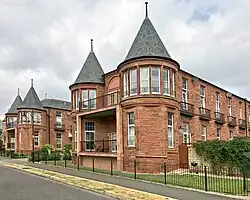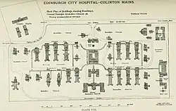 The hospital was on a greenfield site at Colinton on the southern outskirts of the city. It was built close to the Edinburgh City (Craiglockhart) Poorhouse, (which later became Greenlea Old People's Home,[3] and was redeveloped in the 1980s as residential housing known as The Steils.)[4] The Third City Hospital, now known as the Colinton Mains Fever Hospital, was designed by the Edinburgh City architect Robert Morham, who had toured European fever hospitals to incorporate their best features into his design. In Berlin he was told by Robert Koch that "sunlight is the great germicide", and this advice was followed.[5] The hospital was built in red sandstone and consisted of fifteen two-storey Nightingale pavilions separated by grassy airing grounds to ensure spacing between wards and give them greater exposure to light. All included balconies and sun rooms. There were separate blocks for patients with individual diseases together with isolation cottages. In addition there was a nurses' home, accommodation for doctors, a central administrative block and a bacteriology laboratory. The hospital was surrounded by lawns and a small tree plantation.[5]