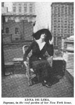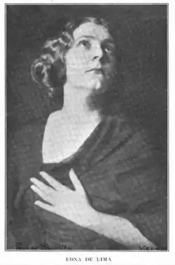 Edna de Lima first sang at New York's Aeolian Hall in 1916.[11] She made her Chicago concert debut in 1917, when a reviewer declared that "Nature has been bounteous to Mme. de Lima in the bestowal of personal attractiveness and grace of manner in addition to the crystalline purity of her voice."[12] She was billed as "formerly of the Vienna Opera" when she appeared at the Stadium Concerts in New York in the summer of 1918.[13] She performed on a bill with pianist Winifred Byrd, tenor Dan Beddoe, and violinist Michel Gusikoff, for the Globe Music Club later in 1918.[14] She translated lyrics for recitalists, including Margaret Matzenauer. During World War I, she sang at concerts for the Liberty Bond Campaign,[15] and for the Red Cross.[16]