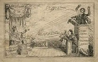 He had prepared himself, as he thought, for teaching political, legal, and scientific men; he did not attempt to win them through abstract, worn-out theological arguments, but discussed the opinions, poetry, politics, manners and customs of the time. Rather than address these issues through a comprehensive philosophical approach, Irving's method was one of severe satire varied by fierce denunciation.[5]