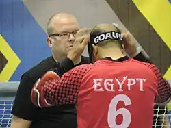 Eyeshade check of player no. 6 at the World Goalball Championships, Malmö, Sweden (2018).