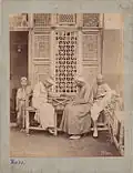 One of the outer garments was the aforementioned tob, thob, sebleh, or tob sebleh, which was a large, loose caftan with very wide sleeves, usually in a black or blue color. A poor woman's might be made of cotton. A wealthier woman's could be cotton with silk stripes, taffeta, or watered silk.[24] Sometimes the wealthy woman's tobs were rose, pink, or violet in color, but a poor woman's was typically blue.[26] Mantles such as the melaya leff were also worn, as were face veils,[22] and the tarha, a scarf worn over the head and down the back. The tarha was of embroidered white muslin, colored crepe with gold embroidery and spangles, or dark blue cotton or linen for poor women. The face veil was black or deep blue, and sometimes decorated with gold or silver pieces, false pearls, coral, and chain tassels.[26]