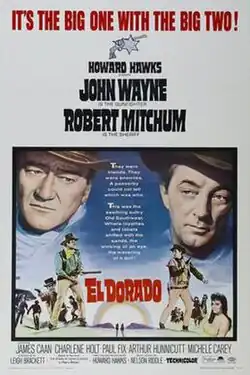 El Dorado is a 1966 American Western film directed and produced by Howard Hawks and starring John Wayne and Robert Mitchum. Written by Leigh Brackett and loosely based on the novel The Stars in Their Courses by Harry Brown, the film is about a gunfighter who comes to the aid of an old friend who is a drunken sheriff struggling to defend a rancher and his family against another rancher trying to steal their water. The supporting cast features James Caan, Charlene Holt, Paul Fix, Arthur Hunnicutt, Michele Carey, R. G. Armstrong, Ed Asner, Christopher George, Adam Roarke, and Jim Davis.