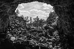 The lava flows, cinder cones, and other volcanic features of El Malpais are part of the Zuni-Bandera volcanic field, the second largest volcanic field in the Basin and Range Province.[3] This volcanically active area on the southeast margin of the Colorado Plateau is located on the ancient Jemez Lineament, which provides the crustal weakness that recent magmatic intrusions and Cenozoic volcanism are attributed to.[5]