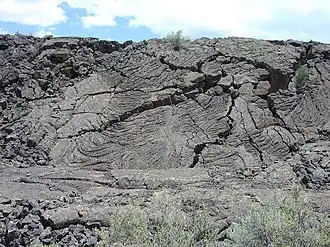 The rugged pahoēhoē and ʻaʻā lava flows of the Zuni-Bandera eruptions (also called the Grants Lava Flows) filled a large basin, created by normal faulting associated with the Rio Grande Rift, between the high mesas of the Acoma Pueblo to the east, Mt. Taylor to the north, and the Zuni Mountain anticline to the northwest. Vents associated with these flows include Bandera Crater, El Calderon, and several other cinder cones; more than a dozen older cinder cones follow a roughly north–south distribution along the Chain of Craters west of the monument.[6]