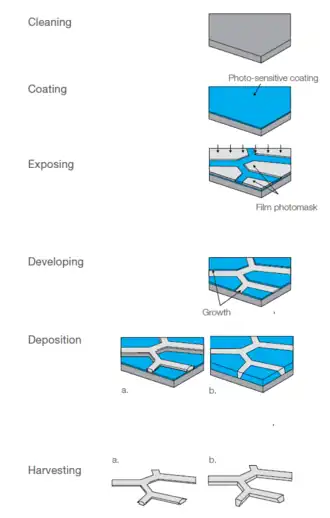 Compared to other basic metal forming processes (casting, forging, stamping, deep drawing, machining, and fabricating), electroforming is very effective when requirements call for extreme tolerances, complexity, or light weight. The precision and resolution inherent in the photo-lithographically produced conductive patterned substrate allows finer geometries to be produced to tighter tolerances while maintaining superior edge definition with a near-optical finish. Electroformed metal can be extremely pure, with superior properties over wrought metal due to its refined crystal structure. Multiple layers of electroformed metals can be bonded together, or to different substrate materials, to produce complex structures with "grown-on" flanges and bosses.