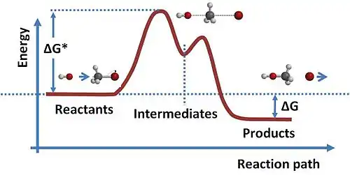 A typical reaction path requires the initial reactants to cross an energy barrier, enter an intermediate state and finally emerge in a lower energy configuration. If charge separation is involved, this energy difference can result in an emf. See Bergmann et al.[35] and Transition state.