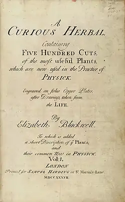23. ^ Blackwell, Elizabeth; Harding, Samuel; Nourse, John (30 July 1737). A curious herbal :containing five hundred cuts, of the most useful plants, which are now used in the practice of physick engraved on folio copper plates, after drawings taken from the life. Printed for Samuel Harding.