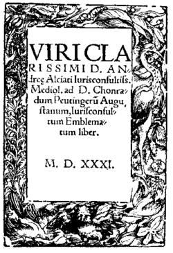 The Emblemata, or Emblematum liber first appeared in Augsburg (Germany) in 1531 under the title Viri Clarissimi D. Andreae Alciati Iurisconsultiss. Mediol. Ad D. Chonradum Peutingerum Augustanum, Iurisconsultum Emblematum Liber. Produced by the publisher Heinrich Steyner, the unauthorized first print edition was compiled from a manuscript of Latin poems which the Italian jurist Andrea Alciato had dedicated to his friend Conrad Peutinger and circulated to his acquaintances. The 1531 edition was soon followed by a 1534 edition authorized by Alciato: published in Paris by Christian Wechel, this appeared under the title Andreae Alciati Emblematum Libellus ("Andrea Alciato's Little Book of Emblems").[1] The word "emblemata" is the plural of the Greek word ἔμβλημα, meaning a piece of inlay or mosaic, or an ornament: in his preface to Peutinger, Alciato describes his emblems as a learned recreation, a pastime for humanists steeped in classical culture.