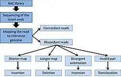 Inversions and translocations are relatively easy to detect by an invalid pair of sequenced-end. For instance, a translocation can be detected if the paired-ends are mapped onto different chromosomes on the reference genome.[4][5] Inversion can be detected by divergent orientation of the reads, where the insert will have two plus-end or two minus-end.