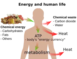The basal metabolism rate measures the food energy expenditure per unit time by endothermic animals at rest.[46] In other words it is the energy required by body organs to perform normally. For humans, metabolic equivalent of task (MET) compares the energy expenditure per unit mass while performing a physical activity, relative to a baseline. By convention, this baseline is 3.5 mL of oxygen consumed per kg per minute, which is the energy consumed by a typical individual when sitting quietly.[47]