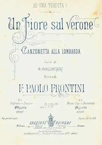 - Un fiore sul verone , words by Enrico Golisciani, music by Francesco Paolo Frontini, Ricordi, 1883