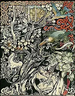 Nick Groom suggests some other possible sources, besides Shakespeare. The Gospel of Mark has the speech by a man cured of blindness "I see men as trees, walking."(Mark 8:24) Algernon Blackwood's 1912 story "The Man Whom the Trees Loved" suggests that "trees had once been moving things, animal organisms of some sort, that had stood so long feeding, sleeping, dreaming, or something, in the same place, that they had lost the power to get away", which Groom remarks sounds just like Treebeard's account of Ents going "sleepy and 'tree-ish'".[3] He notes, too, Arthur Rackham's drawings with "bristly, twisted, anthropomorphic trees that appear as the guises of Elves and other supernatural beings", while Disney's 1932 Silly Symphony episode Flowers and Trees features trees that walk.[3]
