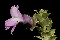 The flowers are borne singly in leaf axils on a hairy stalk 9–28 mm (0.4–1 in) long. There are 5 green to purple, overlapping, egg-shaped to lance-shaped sepals which are mostly 5–10 mm (0.2–0.4 in) long and which end in a spine. The petals are 20–35 mm (0.8–1 in) long and are joined at their lower end to form a tube. The petal tube is lilac-coloured, purple or violet on the outside, while the inside of the tube and lower part of the lobes are whitish with reddish-brown spots. The outside surface of the tube and petal lobes is hairy but the inside surface of the petal lobes is glabrous while the tube is filled with long, soft hairs. The lower lobe is often pushed up and closes the opening of the petal tube. The 4 stamens are fully enclosed in the petal tube. Flowering occurs from June to August and is followed by fruit which are dry, woody, oval-shaped, about 7–12 mm (0.3–0.5 in) long and have a hairy, papery covering.[2][3]