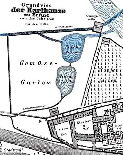 The charterhouse survived the Reformation but was much reduced. It was looted in the Peasants' War, the Thirty Years' War and finally at secularisation in 1803, and nothing survived of its once-substantial treasury.[2] Its library however passed to the University of Erfurt.[3]