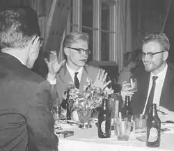 ![]() Salmenhaara (center) talking with Swedish composer Jan Bark (right), circa 1963 | |