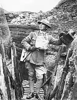 After the outbreak of the First World War he served in the Royal Naval Volunteer Reserve, enlisting on 25 January 1915.[17] When the Gallipoli landings were being prepared, Winston Churchill (then First Lord of the Admiralty), who had himself been a war correspondent, arranged for there to be journalists and photographers accompanying the expeditionary force. Brooks, as a professional photographer already in uniform, was appointed as the Admiralty official photographer.[10] In March 1916, he was transferred from the Admiralty to the War Office, given the honorary rank of second lieutenant and appointed the official photographer for the Western Front.[18]
