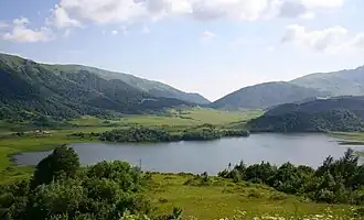 Ertso Lake (Georgian: ერწოს ტბა) is a karst lake[1][2] in the Java Municipality, Shida Kartli region of Georgia.[3] Located in Qvirila river basin, north-west side of the Ertso-Tsona depression, at 1710 m above sea level. Lake Ertso is the biggest known karst lake in Georgia. The area of surface is 0.31 km2, while the catchment area is 5.85 km2. Average depth is 2,1 m, maximal depth is 19 m.[4] The shape of the shore line is complicated. Three permanent rivers inflows of the lake. Lake Ertso extends in a roughly longitudinal direction. Four sinkholes are filled with water. Gets its feed from snow, rainfall and underground waters. The lake surface water temperature is 23–25 °C. The water level is high during May and June and is low during August and September. The lake freezes for almost 5 months in winter.[4] Lake Ertso is included in the "Red List of Georgia".[5] The village of Ertso is located eastern side.