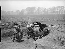 Men of the 2nd Battalion, Essex Regiment with a French Hotchkiss 25mm SA 34 anti-tank gun, Meurchin, France, 27 April 1940.