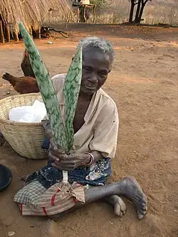 Rufina James of Humbe, Manica Province Mozambique shows the Sansevieria hyacinthoides she uses to treat chicken diseases