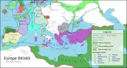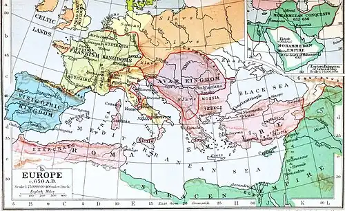 A cultural definition of Europe as the lands of Latin Christendom coalesced in the 8th century, signifying the new cultural condominium created through the confluence of Germanic traditions and Christian-Latin culture, defined partly in contrast with Byzantium and Islam, and limited to northern Iberia, the British Isles, France, Christianised western Germany, the Alpine regions and northern and central Italy.[38][39] The concept is one of the lasting legacies of the Carolingian Renaissance: Europa often figures in the letters of Charlemagne's court scholar, Alcuin.[40] The transition of Europe to being a cultural term as well as a geographic one led to the borders of Europe being affected by cultural considerations in the East, especially relating to areas under Byzantine, Ottoman, and Russian influence. Such questions were affected by the positive connotations associated with the term Europe by its users. Such cultural considerations were not applied to the Americas, despite their conquest and settlement by European states. Instead, the concept of "Western civilisation" emerged as a way of grouping together Europe and these colonies.[41]