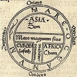 The first recorded usage of Eurṓpē as a geographic term is in the Homeric Hymn to Delian Apollo, in reference to the western shore of the Aegean Sea. As a name for a part of the known world, it is first used in the 6th century BCE by Anaximander and Hecataeus. Anaximander placed the boundary between Asia and Europe along the Phasis River (the modern Rioni River on the territory of Georgia) in the Caucasus, a convention still followed by Herodotus in the 5th century BCE.[30] Herodotus mentioned that the world had been divided by unknown persons into three parts—Europe, Asia, and Libya (Africa)—with the Nile and the Phasis forming their boundaries—though he also states that some considered the River Don, rather than the Phasis, as the boundary between Europe and Asia.[31] Europe's eastern frontier was defined in the 1st century by geographer Strabo at the River Don.[32] The Book of Jubilees described the continents as the lands given by Noah to his three sons; Europe was defined as stretching from the Pillars of Hercules at the Strait of Gibraltar, separating it from Northwest Africa, to the Don, separating it from Asia.[33]