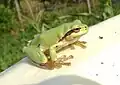 The European tree frog (Hyla arborea) is a small tree frog. As traditionally defined, it was found throughout much of Europe, Asia and northern Africa,[3] but based on molecular genetic and other data several populations formerly included in it are now recognized as separate species (for example, H. intermedia of Italy and nearby, H. molleri of the Iberian Peninsula, H. meridionalis of parts of southwestern Europe and northern Africa, and H. orientalis of parts of Eastern Europe, Turkey and the Black Sea and Caspian Sea regions), limiting the true European tree frog to Europe from France to Poland and Greece.[4][5][6]
