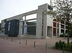 The Church Centre was created in the style of a monastery and rendered simply in concrete and glass. Around the Brunnenhof ("Paradise," a leafy area used for events) are 25 apartments, as well as apartments for the sexton and the pastor. At the Brunnenhof stands a statue, crafted by German sculptor Ulrich Rückriem, using granite bleu de vire from Normandy.