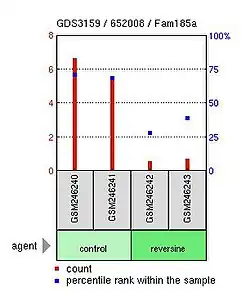 While little data is currently available on differential expression in humans, FAM185a expression is greatly decreased in ROR1-alpha knockout mice and toll-like receptor 5 knockout mice.[13] Mice also show a decrease in FAM185a expression in tissues that have been treated with Reversine, indicating the protein's potential role relates to stem cell differentiation during development.[13] GEO profiles for mice also show that FAM185a expression begins after fertilization, and continues to be high throughout embryonic development.[13]