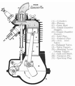 The FN Four's engine was designed by Paul Kelecom, who had designed single-cylinder engines prior to the FN.[16] The air-cooled longitudinal layout was prone to overheating the rear cylinders, a trait overcome in later designs with water cooling and transverse layout.[17]