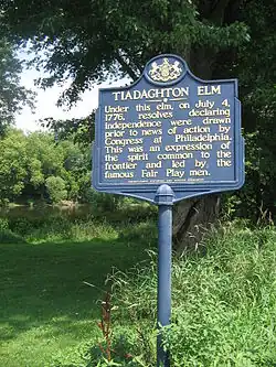 Pennsylvania Historical and Museum Commission marker at the site of the Tiadaghton Elm in 2006; the elm died in the 1970s.