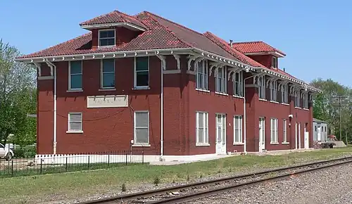 The Fairbury Rock Island Depot and Freight House in Fairbury, Nebraska is a historic railroad station and freight house complex which served trains of the Chicago, Rock Island and Pacific Railroad (Rock Island Line). The Renaissance Revival passenger station began construction in 1913 and had a grand opening on February 10, 1914. The second story of the station housed the Western Division Headquarters for the railroad. The passenger station served trains including the Rock Island's Rocky Mountain Rocket from Chicago to Colorado Springs and Denver.[1] When the Rocky Mountain Rocket was terminated on October 15, 1966, the Rock Island's passenger service was discontinued at Fairbury. The division offices had been relocated a year earlier.[2] The adjacent metal freight house was constructed in 1940 and served the railroad until 1963.