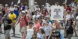 During this rally, most of the country was entering the first day of the first major summer heat wave of 2018, with temperatures ranging between high 90s and triple digits for various cities. Rally organizers cautioned people to use plenty of sunscreen and drink water; a few hundred yards away from the stage in Lafayette Square, a fire truck sprayed its hose in the air to cool off the crowd.[21] | ||