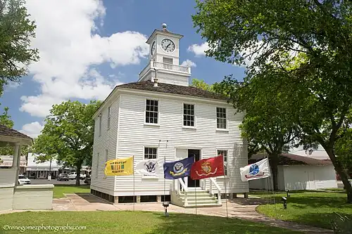 The Fayette County Precinct No. 2 Courthouse, built in 1880 is wood-frame construction with horizontal wood siding and has a simple two story square plan. The south elevation is the facade with simple wood stairs and solid wood panel double doors. Windows are symmetrically placed with three bays on the north and south, and two on the east and west.[2] Construction of the Victorian style building was funded by US$600 (equivalent to $19,550 in 2024) in contributions from the citizens of Fayetteville and an additional US$200 in tax funds from the County Commissioners' Court. Funding for painting the building was raised by holding a ball. A calaboose (holding jail) with two cells was finished in 1887.[3] A clock tower, financed by a ladies club, was added in 1934 in the center of the hipped roof.[2][3] It is no longer used as a courthouse. Precinct courthouses were quite rare in early Texas and this one was listed as an RTHL in 1997.[2] The other government building, the post office, is not considered historical, dating from the late 1960s.[2]
