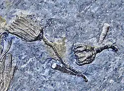 24. ^ a b c Burdick, D., Strimple, H. 1973. Flexible Crinoids from the Fayetteville Formation (Chesterian) of Northeastern Oklahoma. Journal of Paleontology. 47:2