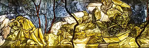 He did monumental works such as murals and sculptures, with one of the first a mural with Roberto Montenegro in 1934.[10] These works can be found at universities, government buildings and private homes.[11] From 1951 to the early 1960s, he devoted most of his time painting murals in private homes, with a number of these since acquired by the government of Nuevo León.[4][6] In the 1950s, he created a mural at the headquarters of the Instituto Mexicano de Seguro Social in Mexico City called Las Enseñanzas de Quetzalcoatl and another called Maternidad Yacente. The first was damaged by the 1985 Mexico City earthquake, and was repaired by his son, Cantu Fabila and his wife Elsa. In 1958 he sculpted two stone slabs for the exterior of the Unidad Independencia theater in Mexico City. However, the day after they were finished, they were robbed. A similar fate happened to one of the copies of the IMSS emblem.[8] He created a low relief called El Flechador del sol in 1961 on the Sierra Madre along the highway between Linares and Galeana in the municipality of Iturbide, Nuevo León. However, this work crumbled in 2002, with recovered pieces now on display at a site museum.[4][8] His last monument was designed in 1988, and was dedicated to Alfonso Reyes.[6] One notable mural is Los informantes de Sahagún at the former monastery of San Diego, which was the site of the Pinacoteca Virreinal in Mexico City. He also created a mural dedicated to Greek myth at the Philosophy and Letters department of the Universidad Autónoma de Nuevo León.[4] He also created murals for a church in San Miguel Allende but they were defaced due to a dispute between the artist the institution over how the characters were portrayed.[3][8]