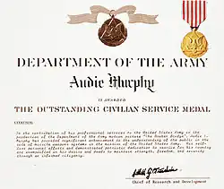 151. ^ Dept. of the Treasury. "Medal of Honor with Audie Murphy". U.S. National Archives and Records Administration ARC Identifier 5727074. Retrieved 10 October 2013.