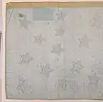 The common reconstruction consists of a green field and a constellation of thirteen five-pointed white stars representing the thirteen colonies arranged in a natural pattern within an azure canton. The existing fragments consist of the canton from the flag, which has remnants of green silk on three sides, and a piece of green cloth with flourish from elsewhere on the flag.[4]