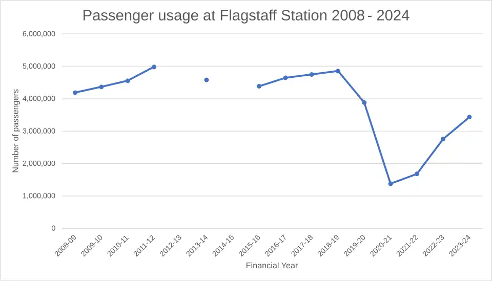Passenger usage at Flagstaff Station between 2008 and 2024 sorted by financial year.