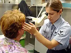 The Fleet Marine Force enlisted warfare specialist device (FMFEWS) is a qualification insignia of the United States Navy earned by enlisted U.S. Navy sailors assigned to the Fleet Marine Force of the U.S. Marine Corps who have successfully completed the requirements of the Enlisted Fleet Marine Force Warfare Specialist (EFMFWS) program per OPNAV Instruction 1414.4B. This involves serving one year with a Marine Corps unit (two years for reserves), passing the Marine physical fitness test (PFT), a written test, demonstrating skills used in service with the Marines such as weapon breakdown and familiarization, land navigation, combat communications and an oral examination by senior enlisted sailors who are FMF qualified. The Enlisted Fleet Marine Force Warfare Specialist designation is most commonly awarded to the hospital corpsman (HM) and religious program specialist (RP) ratings, although it is also awarded to other sailors who support Marine Corps commands (e.g. logistics specialists assigned to medical logistics companies). It was created in 2000.[2][3][4][5]