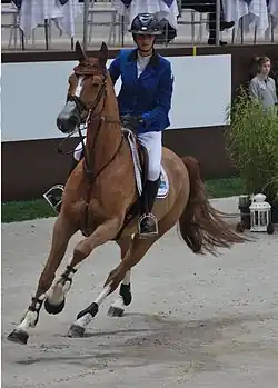 Flora de Mariposa had an excellent season in 2015. However, the rider withdrew due to an injury to her mount at La Baule in May,[16] caused by a small bone contusion in the left front foot following a shock.[17][18] This cast doubt on their participation in the European Championships in August.[19] Flora de Mariposa slowly began trotting again in June.[20] After two months' rest, she made her comeback at the CSI2* (two-star international jumping competition) in Dettighofen, Germany.[21] She took second place at the CSIO (official international jumping competition) in Hickstead in August.[22] In top form for the European Show Jumping Championships in Aachen two weeks later, Flora de Mariposa makes a fault on the palanque in the team competition, which results in a fifth-place finish for France in the team competition.[13] However, she finished the individual classes in fourth place.[23] Voted Horse of the Year 2015 by L'Éperon magazine, Flora de Mariposa receives her award at the Paris Horse Show in December.[24]