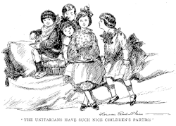 Her keen sense of humor crops out in every group, and the turn of a line gives a comical effect. The peculiar gift that Mrs. Shinn is endowed with is that she can draw the most pitiful little figures and yet infuse into the picture a happy, healthy atmosphere that impresses us with the worth and joy of living. Her characters are never caricatures; they are appealing and provoke the laughter that bears no malice.[11]