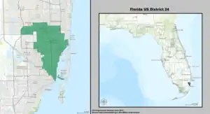 Florida's 24th congressional district is an electoral district for the U.S. Congress, located in southeast Florida. It was redrawn after the 2020 U.S. census. This district includes parts of Miami north of Florida State Road 112, including Little Haiti, as well as Brownsville, Biscayne Park, North Miami, Miami Gardens, and Opa Locka, along with the southern Broward County communities of Pembroke Park, West Park, and parts of Miramar. In the 2020 redistricting cycle, the district was drawn to include parts of barrier islands northeast of Miami, including Miami Beach and Surfside, while all of Hollywood became part of the new 25th district as Country Club and some of Miami, including Allapattah and Wynwood, became part of the new 26th district.