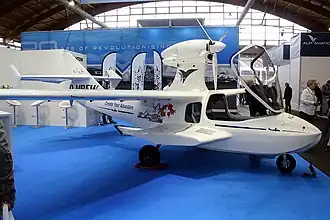 The Flywhale, built mainly from carbon fibre composite materials, is a flying boat style amphibian, with a single step hull and sponsons rather than wing tip floats. It accommodates two in side-by-side seating fitted with a single control between both seats. The design also provides room for two people to sleep in the fuselage.[1][2] A large, one-piece canopy hinges forward for access.[3] Behind the seats is a baggage area. The Flywhale has short-legged, tricycle landing gear[1] with mainwheels retracting backwards into the sponsons.[3] It can operate on land and water.[2]