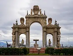 The richly decorated, Mannerist ensemble of the monumental fountain is articulated through three round arches, above which are placed the heraldic symbols of the Viceroy of Naples and his king. In the central arch there is the cup which is supported by two marine animals, while the statues in the remaining two lateral arches represent river divinities holding two monsters of the sea in their hands. Two caryatid statues holding cornucopias are placed at the end of the last arches.