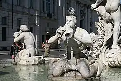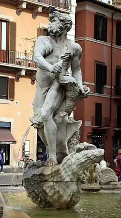 Fontana del Moro (Fountain of the Moor) is a fountain located at the southern end of the Piazza Navona in Rome, Italy. It depicts a nautical scene with tritons, dolphins, and a conch shell.[1] It was originally designed by Giacomo della Porta in the 1570s with later contributions from Gian Lorenzo Bernini in the 1650s.[1] Bernini sculpted a large terracotta model of the central figure, which Giovanni Antonio Mari used as a guide when sculpting the final figure.[2][3] There is a debate around whether or not the central figure was intended by Bernini to depict a Moor.[4] Some of the original sculptures were moved to the Galleria Borghese in 1874.[1] In 2011, the fountain was vandalized.[5]