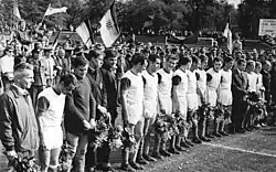 The DTSB and the DFV proposed two solutions to tackle the problem: the best football players should be concentrated in a few football teams and the football departments should be separated from the sports clubs and re-organized as independent football clubs. The concentration of the best football players in the football clubs should be facilitated by better salaries and bonuses, but also through better professional opportunities, such as the prospect of a place at a university.[7] The decision by the Secretariat of the SED Central Committee on 18 August 1965 to form football clubs was an attempt to get football back under the political and technical control of the DTSB in order to "ensure a considerable increase in performance in football".[5] The new football clubs were meant to provide stability to the game at the top level and to supply the national team with talent.[8][9]