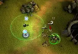 The Mark combat system and the interaction with Balfus are the special features in Forced. Here one player fights three enemies (image cropped and HUD not visible), with each hit giving them marks (in white, above their health bars). The player ordered Balfus (top-left) to move over the shrine nearby, causing him to have a green circular healing aura.